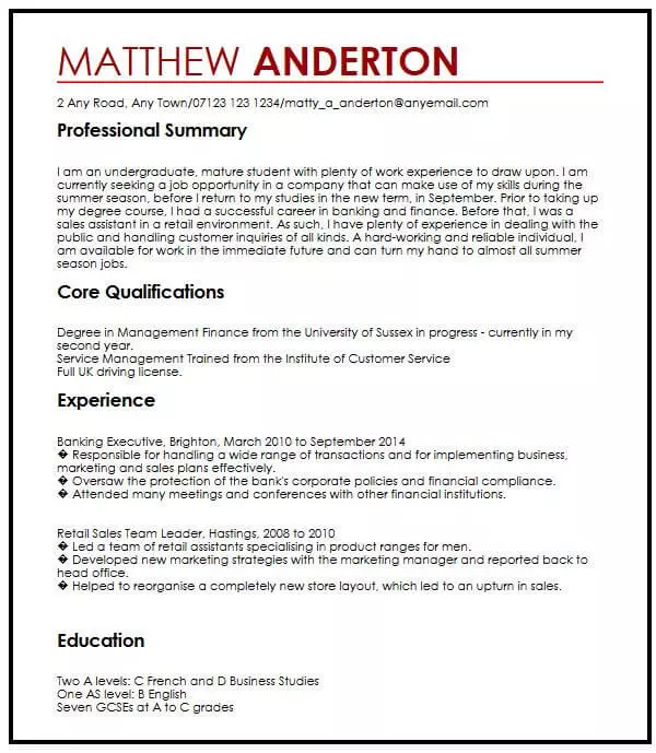 Sometimes it can be also useful to explain your current situation in your profile section in the way our resume example does it. Download the summer job resume template compatible with google docs and word online or see below for more examples.